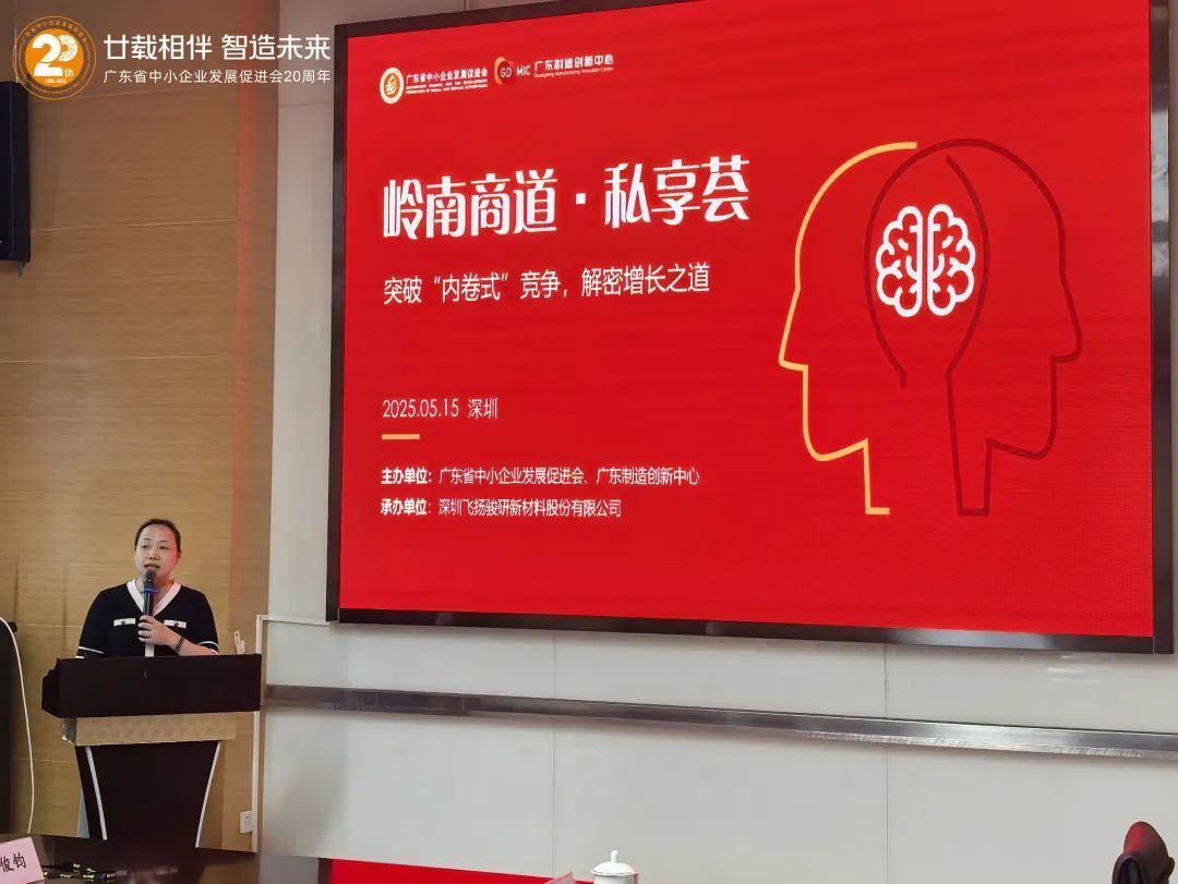 2025年5月15日,由广东省中小企业发展促进会(以下简称“省促进会”)、广东制造创新中心主办的岭南商道·私享荟在国家专精特新重点“小巨人”企业——深圳飞扬骏研新材料股份有限公司(简称“飞扬骏研”)举行,近30位来自各地的企业家共同探寻在激烈的市场同质化竞争中如何找到增长路径。