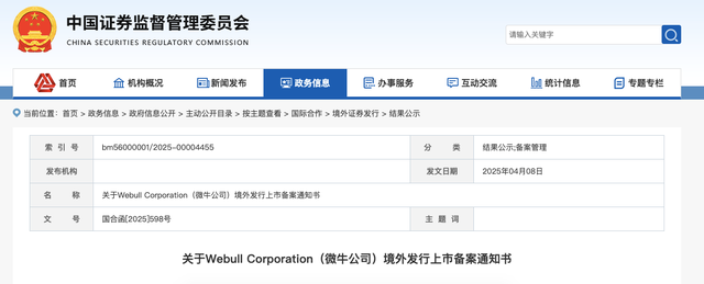4月8日,中国证监会国际合作司发布关于 Webull Corporation微牛公司(简称微牛证券)境外发行上市备案通知书,标志着微牛公司赴美IPO进程迈出关键一步。